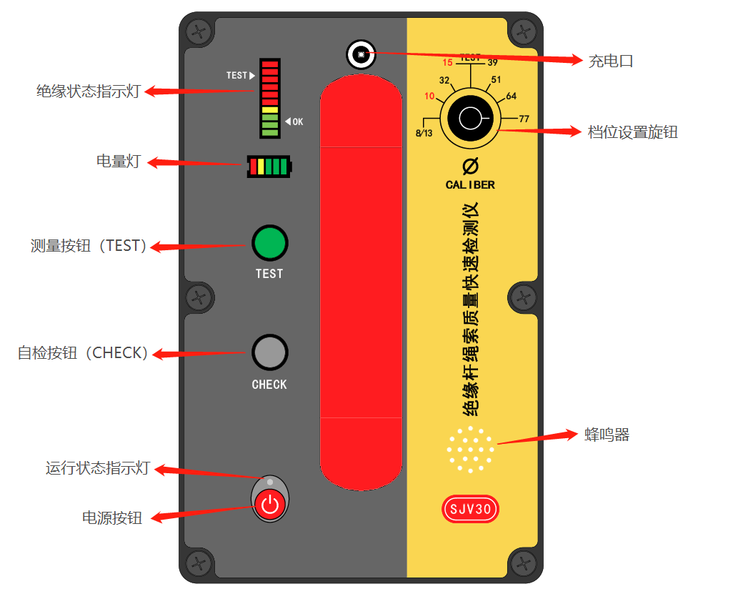 電源按鈕”、“運行指示燈”、“測試按鈕(TEST”、“自檢按鈕(CHECK”、“檔位設置旋鈕”、“充電口”、“絕緣狀態指示燈”、“電池電量指示燈”