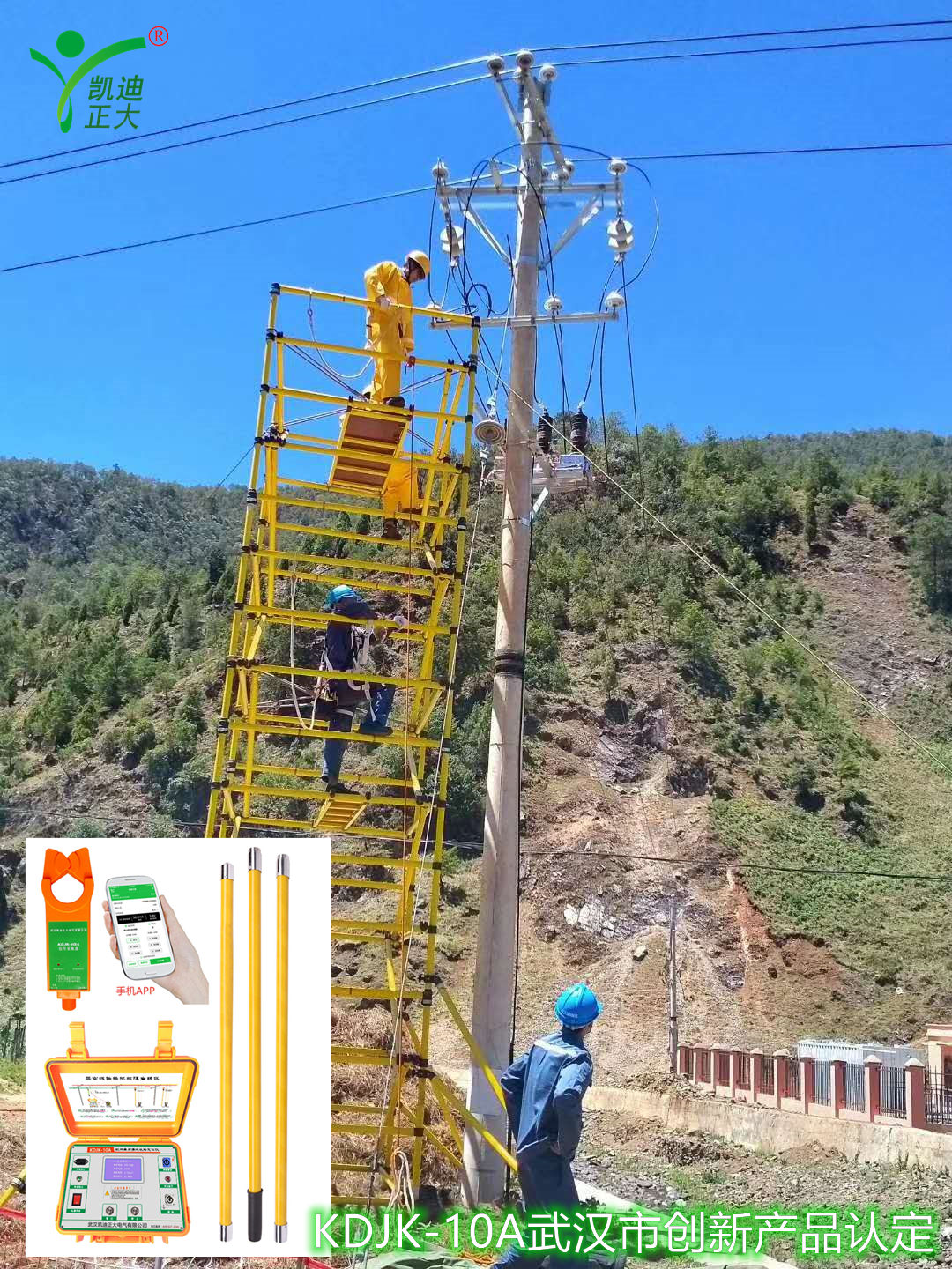 首先將故障線路的開關(guān)斷開;使用KDJK-10A測試地線用接地線與接地棒連接,接地棒接入大地網(wǎng);信號輸出端子與高壓輸出測試線插頭端子連接,其另一端的線鼻子壓擰在接在絕緣掛線桿的蝴蝶母接線柱上,3根絕緣桿用短接線連接,再將掛線桿掛在故障線路上。