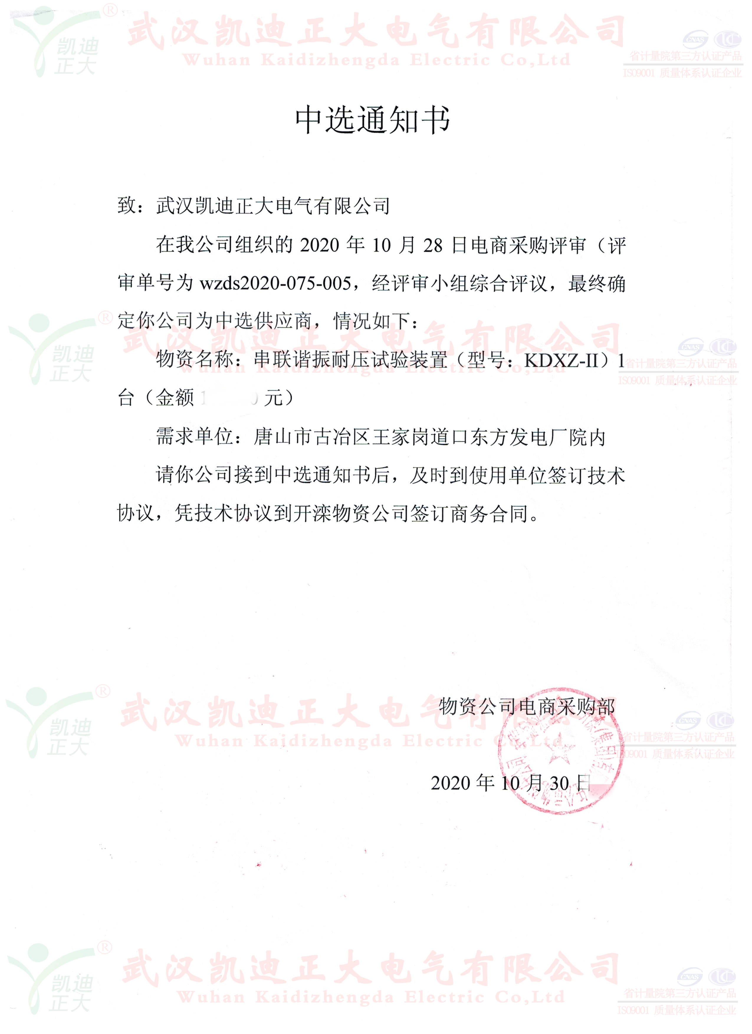 誰無暴風(fēng)勁雨時(shí),守得云開見月明。這個(gè)11月可以說是灰蒙蒙的,經(jīng)歷了洗刷.......。我司與國(guó)內(nèi)大型鋼鐵企業(yè)的合作,各大煤業(yè)集團(tuán)均獲得訂單。這次是開灤集團(tuán)的東方電廠公開詢價(jià)采購(gòu)KDXZ-II串聯(lián)諧振耐壓試驗(yàn)裝置、KDGK-F高壓開關(guān)機(jī)械特性測(cè)試儀等設(shè)備。在與多家電氣設(shè)備制造商的競(jìng)標(biāo)中,我司以優(yōu)質(zhì)口碑、多項(xiàng)專利技術(shù)、精準(zhǔn)售后等高分獲得評(píng)標(biāo)組的認(rèn)可。獲得中選供應(yīng)商。