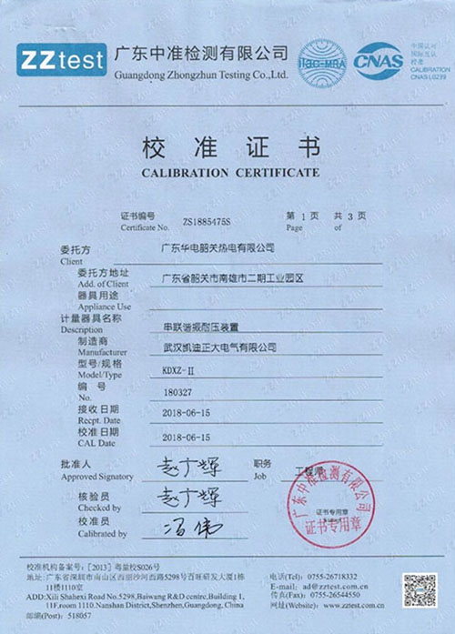 武漢凱迪正大KDXZ--II串聯(lián)諧振耐壓試驗裝置校準證書