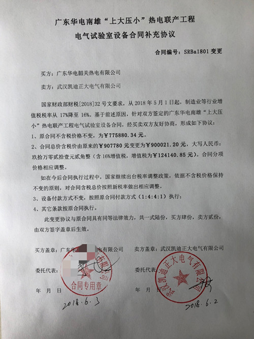 國家財政部財稅[2018]32號文要求,從2018年5月1日起,制造業等行業增值稅稅率從17%降至16%。基于前述原因,針對雙方簽定的廣東華電南雄“上大壓小”熱電聯產工程電氣試驗室設備合同,經買賣雙方友好協商,形成如下協議:
