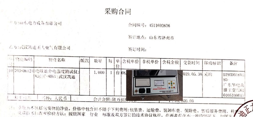 中國華電韶關熱電廠在2017年6月中旬招標采購電氣試驗室設備一批,我司良好的口碑獲得中國華電廣東華電南雄主變(161010510001) 物資設備需求,驗收主變性能需求絕緣油介電強度測試儀;KDJJC-80KV武漢凱迪,采購合同編號:4511892636.