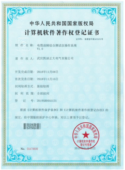 2019年,武漢凱迪正大電氣有限公司新力之作,榮獲中華人民共和國國家版權(quán)局《計算機(jī)軟件著作權(quán)登記證書》系統(tǒng)計算機(jī)軟件著作登記以及質(zhì)量管理體系認(rèn)證證書,其中包含電纜故障綜合測試儀操作系統(tǒng)V1.0(證書號:軟著登字第3475878號)、氧化鋅避雷器帶電測試儀操作系統(tǒng)V1.0(證書號:軟著登字第3478045號)、高壓開關(guān)動作特性測試儀操作系統(tǒng)V1.0(證書號:軟著登字第3478053號)、變頻串聯(lián)諧振耐壓試驗裝置操作系統(tǒng)V1.0(證書號:軟著登字第3475581號)、電纜震蕩波局放定位系統(tǒng)操作系統(tǒng)V1.0(證書號:軟著登字第3475874號)等證書共計5份。權(quán)利取得方式:原始取得。權(quán)利范圍:全部范圍。