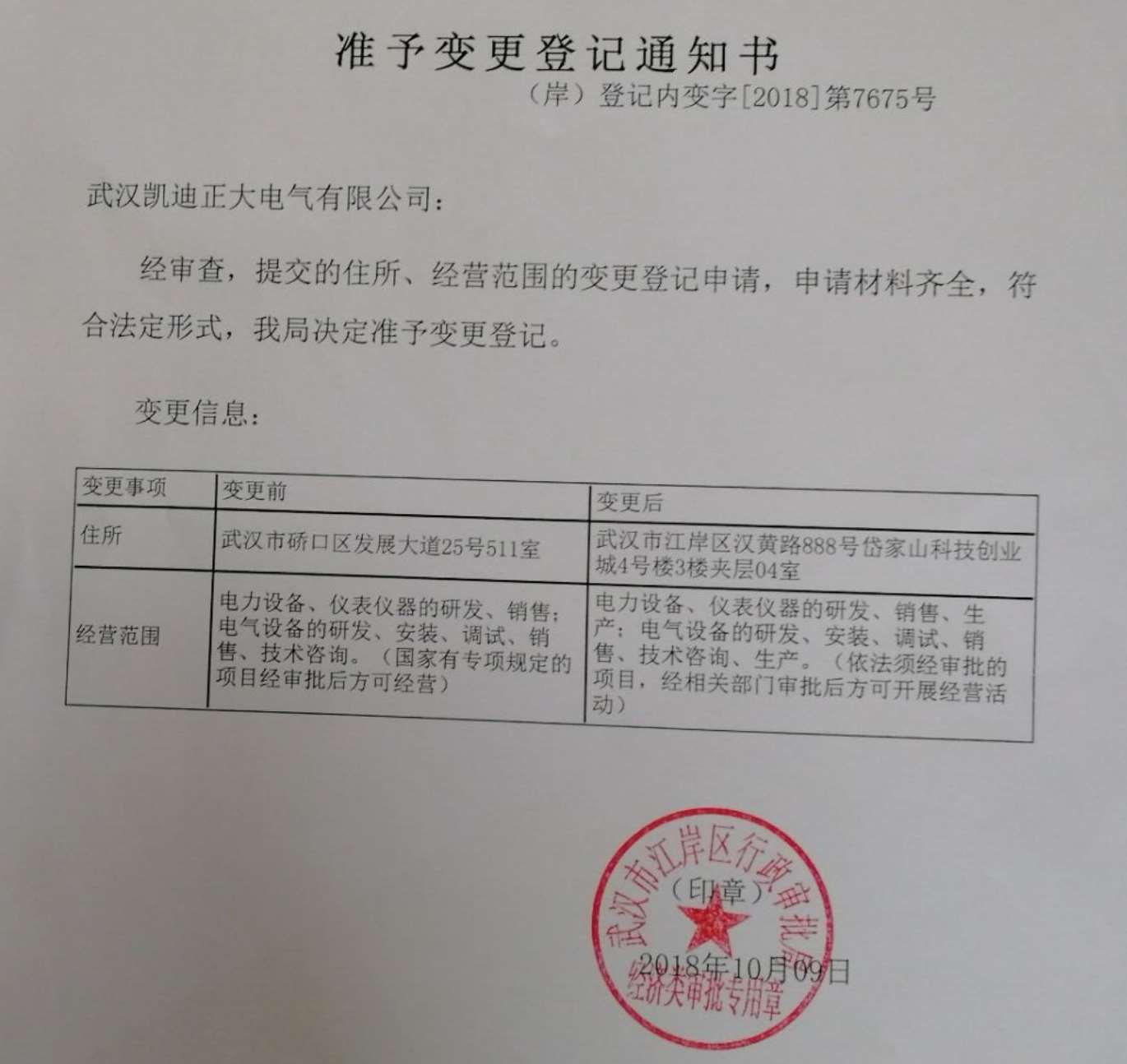 變更前:住所武漢市硚口區發展大道25號511室   經營范圍:電力設備、儀表儀器的研發、銷售;電氣設備的研發、安裝、調試、銷售、技術咨詢。(國家有專項規定的項目經審批后方可經營)