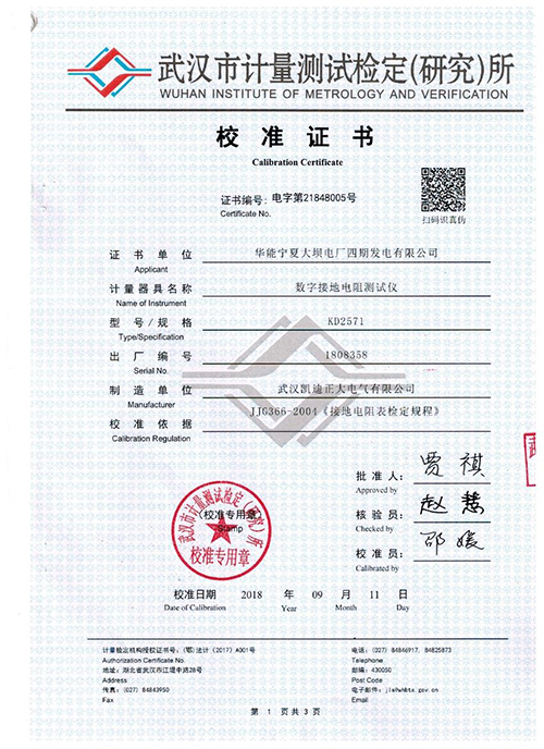 武漢凱迪正大KD2571數(shù)字接地電阻測(cè)試儀校準(zhǔn)證書