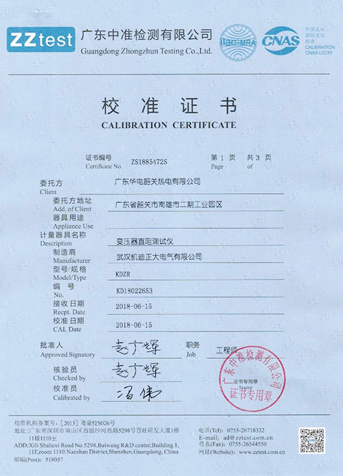 武漢凱迪正大KDZR變壓器直流電阻測試儀校準證書