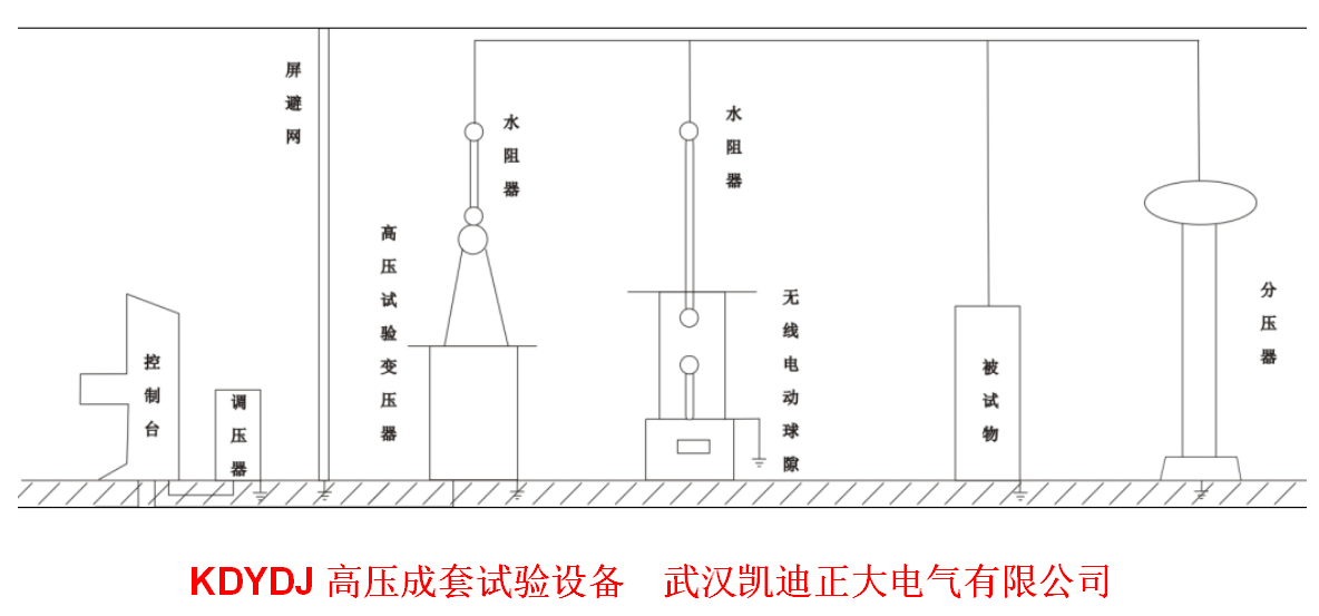成套試驗(yàn)設(shè)備(包括YDJ高壓試驗(yàn)變壓器、KDYD控制臺(tái)、調(diào)壓器、以及球隙器、水電阻、分壓器和被試物)裝配聯(lián)結(jié)示意圖。