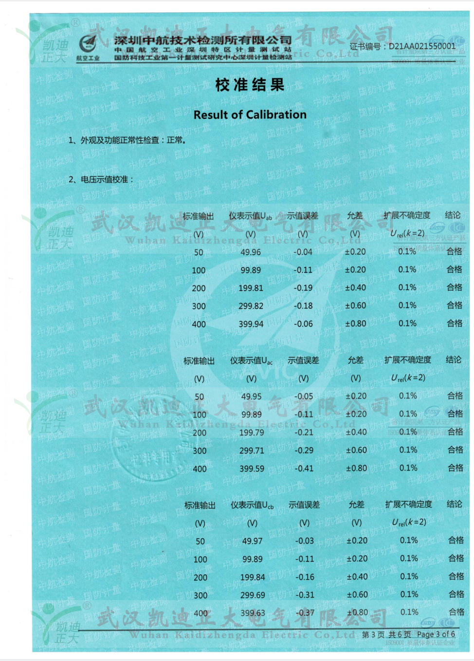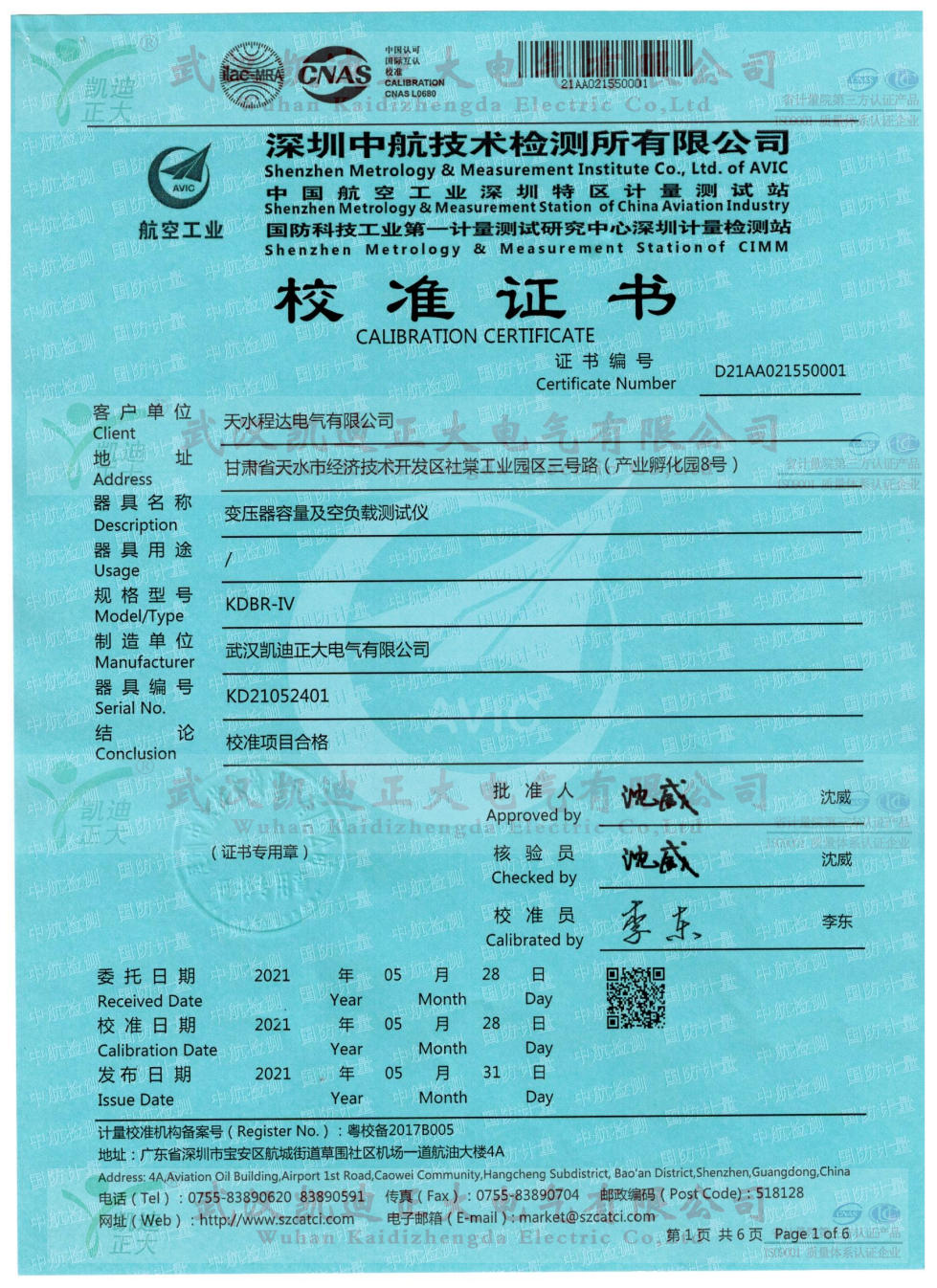 KDBR-IV變壓器容量及特性測試儀是我司老客戶天水程達電氣再次采購的,因多次為質檢所等相關單位提供高低壓成套檢測設備,所以程達電氣對我司產品青睞。應要求需要出具中國合格評定國家認可委員會(CNAS)相關單位的電壓示值校準、電流示值校準、功率示值校準等數據。深圳中航技術檢測大多數限公司(中國航空工業深圳特區計量測試站/國防科技工業第一計量測試研究中心深圳計量檢測站 )是航空工業北京長城計量測試技術研究所、國防科技工業第一計量測試研究中心于1986年投資建立的計量技術檢測服務機構,是深圳市最早的法定計量檢測機構之一,是具有法定計量、國防計量、軍用計量屬性的第三方公正實驗室。