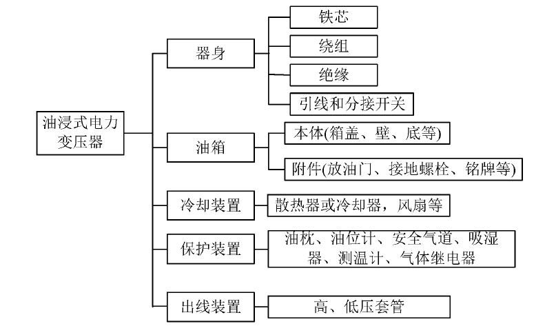 油浸式電力變壓器主要由器身、油箱、冷卻裝置、保護(hù)裝置、出線裝置等幾部分構(gòu)成,具體如圖所示: