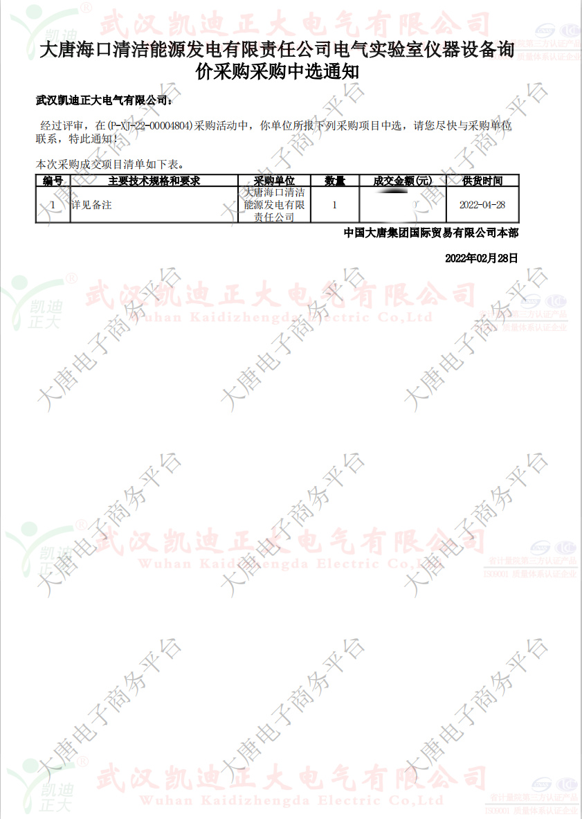 遲日江山麗,春風(fēng)花草香。祝賀我司商務(wù)部再次接到中國(guó)大唐海口清潔能源發(fā)電有限責(zé)任公司電氣實(shí)驗(yàn)室儀器設(shè)備詢(xún)價(jià)采購(gòu)采購(gòu)中選通知。