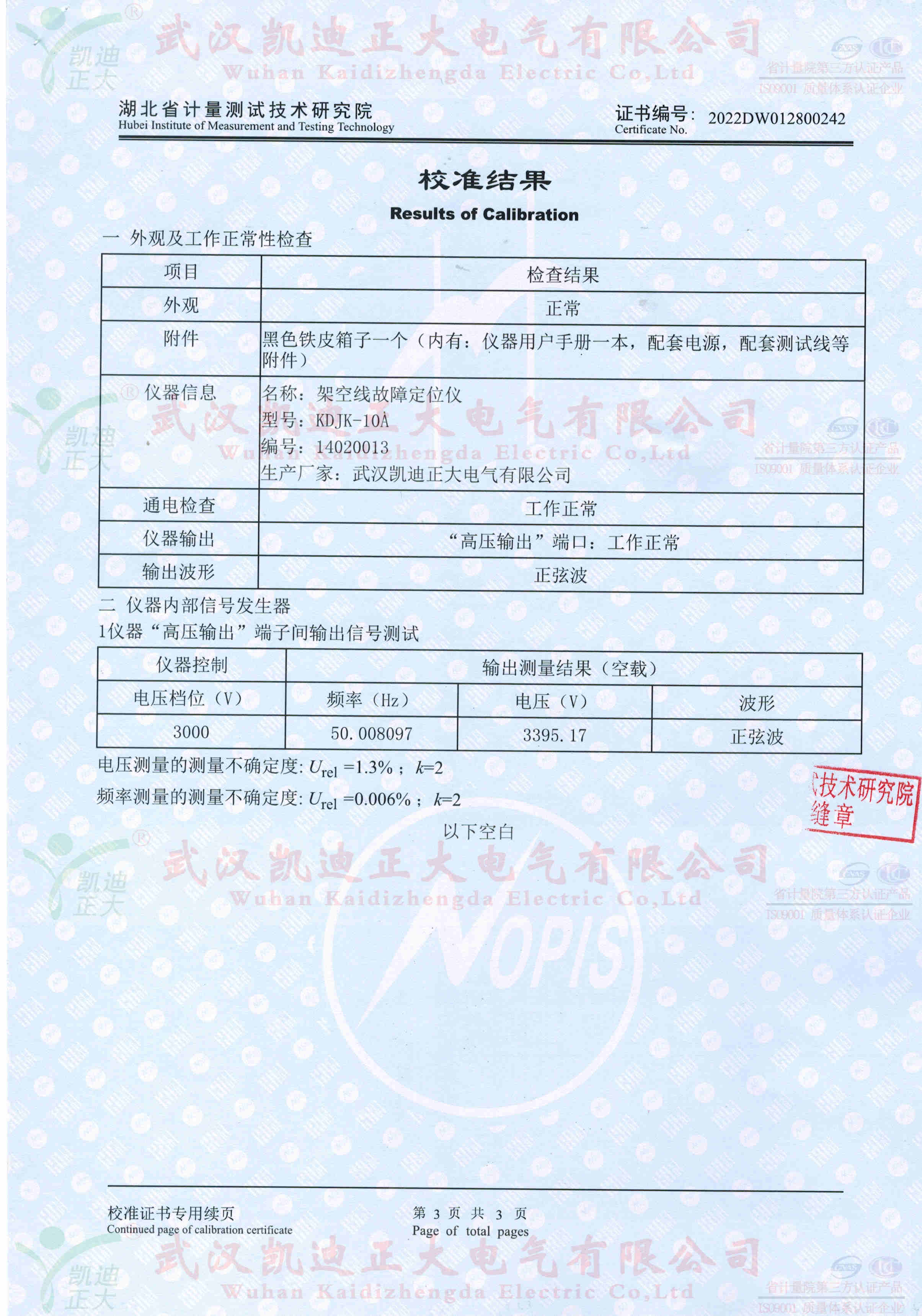 KDJK-10A故障檢測(cè)儀特性及技術(shù)參數(shù)獲得湖北省計(jì)量測(cè)試技術(shù)研究院的校準(zhǔn)證書,設(shè)備為電力工業(yè)電氣設(shè)備質(zhì)量檢驗(yàn)測(cè)試中心的要求。計(jì)量設(shè)備的高壓測(cè)試輸出的電壓、波形正玄波、電壓檔位的選擇。