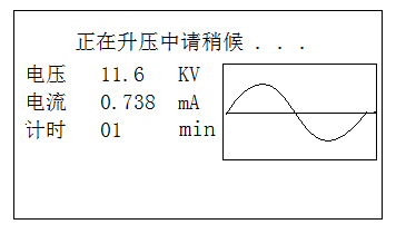 自檢成功后,儀器自動(dòng)進(jìn)入升壓狀態(tài)。儀器將用若干個(gè)周期的時(shí)間(幾分鐘)將電壓升至設(shè)定值。在升壓過程中,按停機(jī)鍵,儀器將切斷電壓輸出,回到開始畫面。當(dāng)升壓值接近設(shè)定值時(shí)出現(xiàn)圖7