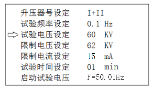 1. 升壓器號(hào)設(shè)定:如果使用I號(hào)升壓器單獨(dú)升壓,升壓器號(hào)設(shè)定為I號(hào)(此時(shí)試驗(yàn)電壓設(shè)定≤30KV),如果使用I號(hào)升壓器和II號(hào)升壓器串聯(lián)升壓,升壓器號(hào)設(shè)定為I+II號(hào)。