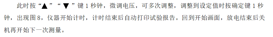 ★另外還有兩種非正常停機(jī):過壓保護(hù)停機(jī)、過流保護(hù)停機(jī)。停機(jī)后出現(xiàn)相應(yīng)的提示界面,放電結(jié)束后,再調(diào)整限制電壓值或限制電流值,再開始下次測(cè)量。