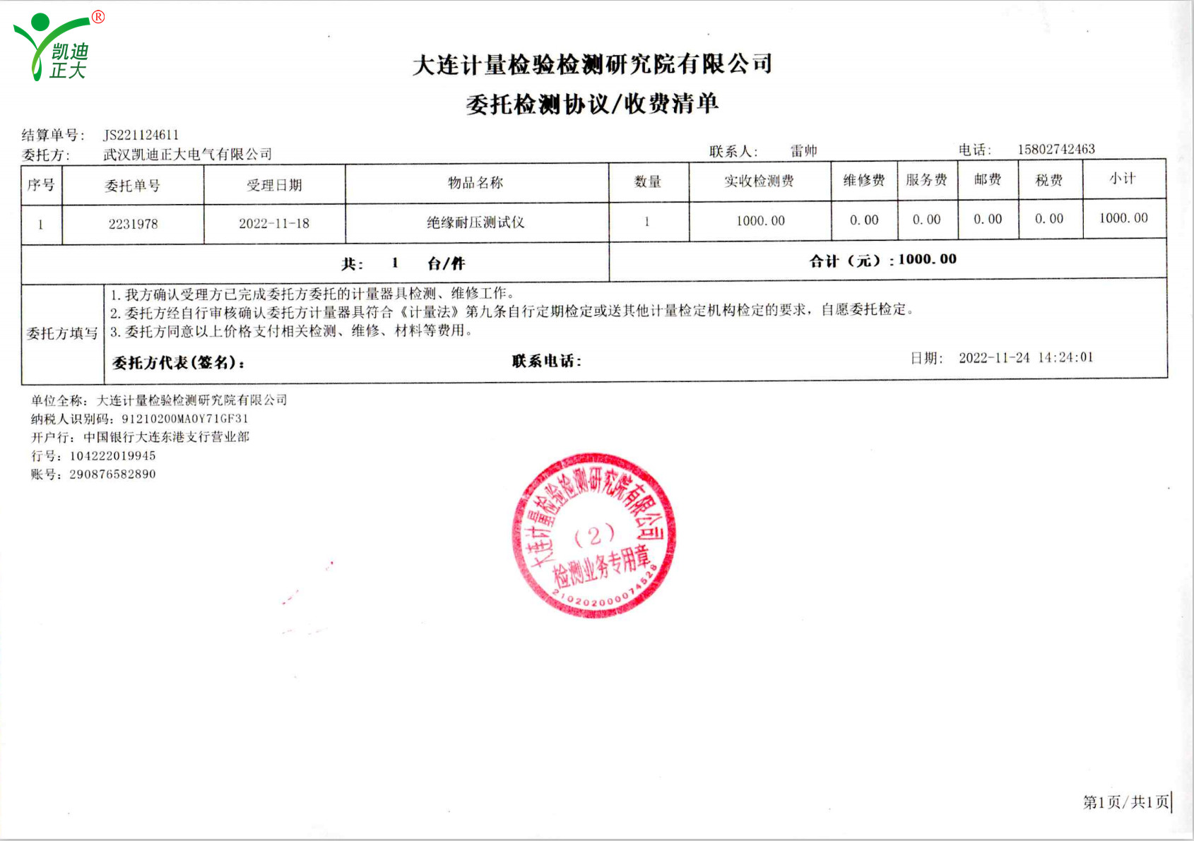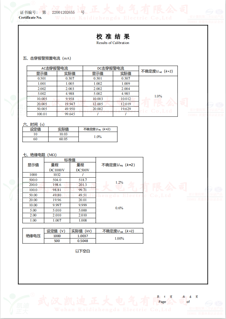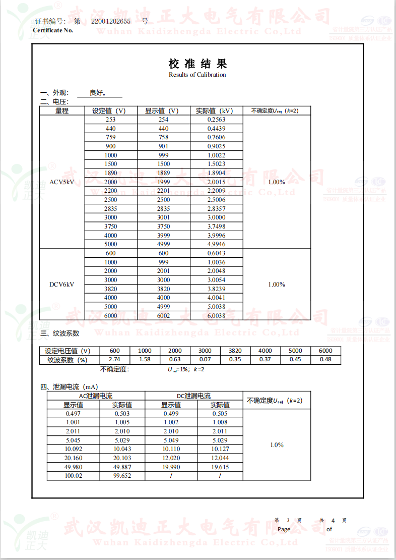低壓成套開(kāi)關(guān)柜KD7742智能耐壓絕緣測(cè)試儀根據(jù)公司制度標(biāo)準(zhǔn)需要獲得中國(guó)認(rèn)可國(guó)際互認(rèn)校準(zhǔn)CNAS檢定機(jī)構(gòu),大連計(jì)量檢驗(yàn)檢測(cè)研究院有限公司出具《KD7742智能耐壓絕緣測(cè)試儀校準(zhǔn)證書》,證書編號(hào):第22001202655號(hào);使用耐電壓測(cè)試儀校驗(yàn)裝置(溯源機(jī)構(gòu)大連計(jì)量檢驗(yàn)檢測(cè)研究院)、ZX117A可調(diào)高阻箱(溯源機(jī)構(gòu)大連計(jì)量檢驗(yàn)檢測(cè)研究院)、FJ-60交直流高壓分壓器(溯源遼寧省計(jì)量科學(xué)研究院)、FZX-II高壓交直流負(fù)載箱(溯源機(jī)構(gòu)大連計(jì)量檢驗(yàn)檢測(cè)研究院)等檢定設(shè)備。