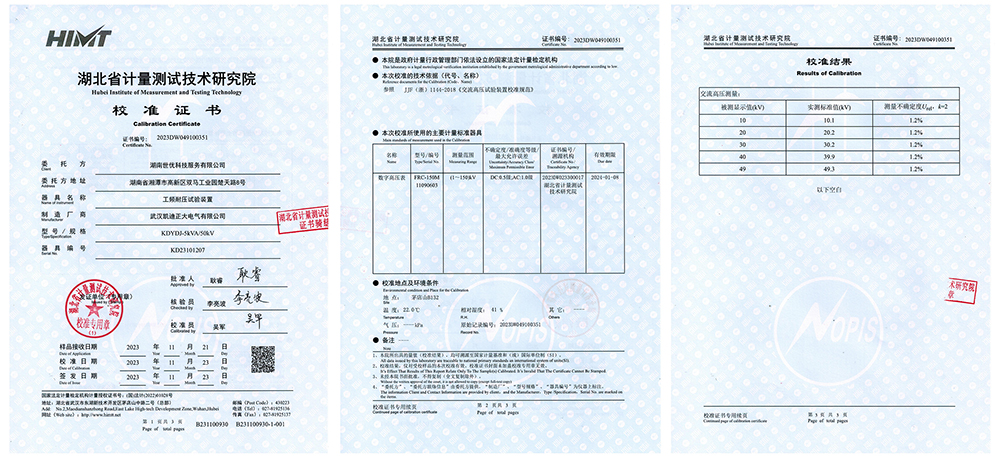 2023年11月23日,湖南世優科技服務有限公司采購我司的KDYDJ-5KVA/50KV工頻耐壓試驗裝置,順利通過湖北省計量測試技術研究院的校準,這標志著我們的產品在品質和質量值得肯定。這一喜訊不僅彰顯了我們的產品質量,也進一步證明了我們在電力行業中的能力和信譽。