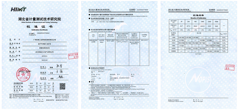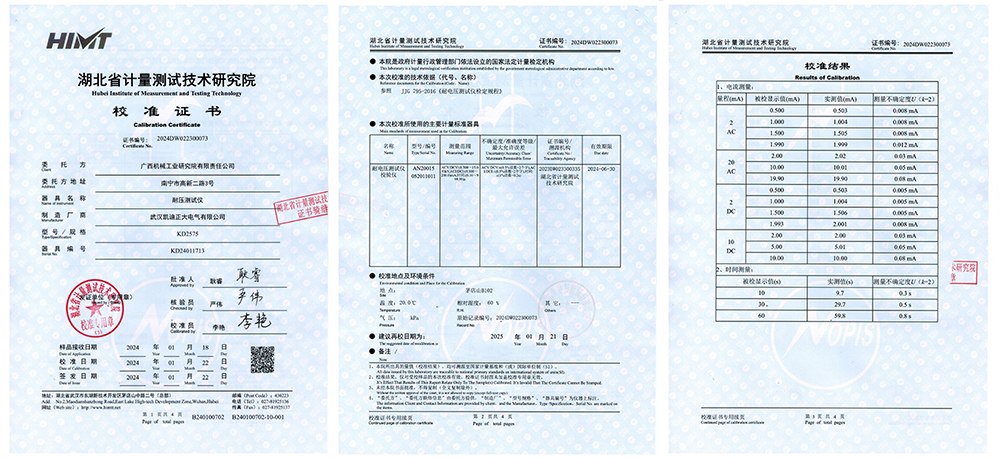2024年1月25日,廣西機械工業研究院有限責任公司成功采購了凱迪正大電氣的KD305A 絕緣電阻測試儀、KD2575 耐壓測試儀、KD2678 30A接地電阻測試儀、KDGK-F 開關特性測試儀等電力儀器儀表,均通過權威的湖北省計量測試技術研究院的嚴格校準。