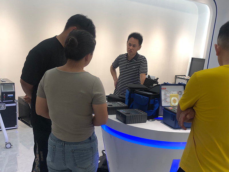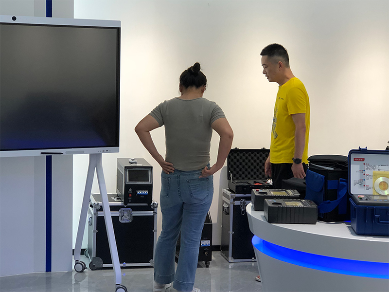 在我公司趙總與王工的陪同下,安徽某電力公司代表首先參觀了寬敞明亮的設(shè)備展廳。這里陳列著各類電力檢測設(shè)備,趙總與王工對展廳陳列的設(shè)備做了大致的講解。并對三相繼電保護測試儀、變壓器容量測試儀及變頻抗干擾介質(zhì)損耗測試儀進行了細致介紹。
