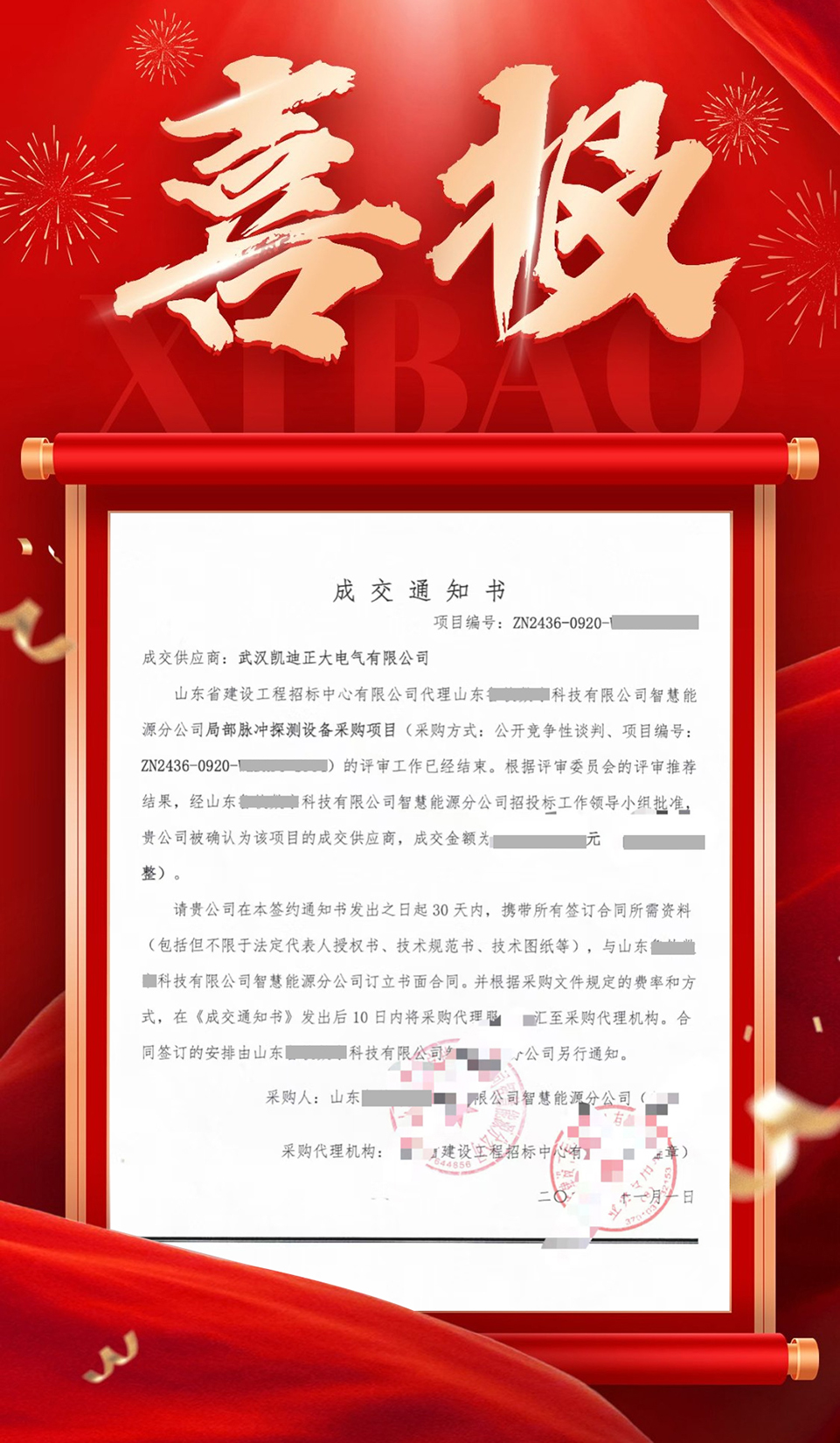 近日,國家電網(wǎng)有限公司電子商務平臺發(fā)布了“山東某數(shù)字科技有限公司智慧能源分公司2024年第七十二批物資類非招標采購項目中標公告”。武漢凱迪正大電氣有限公司成功中標局部脈沖探測設備采購項目。
