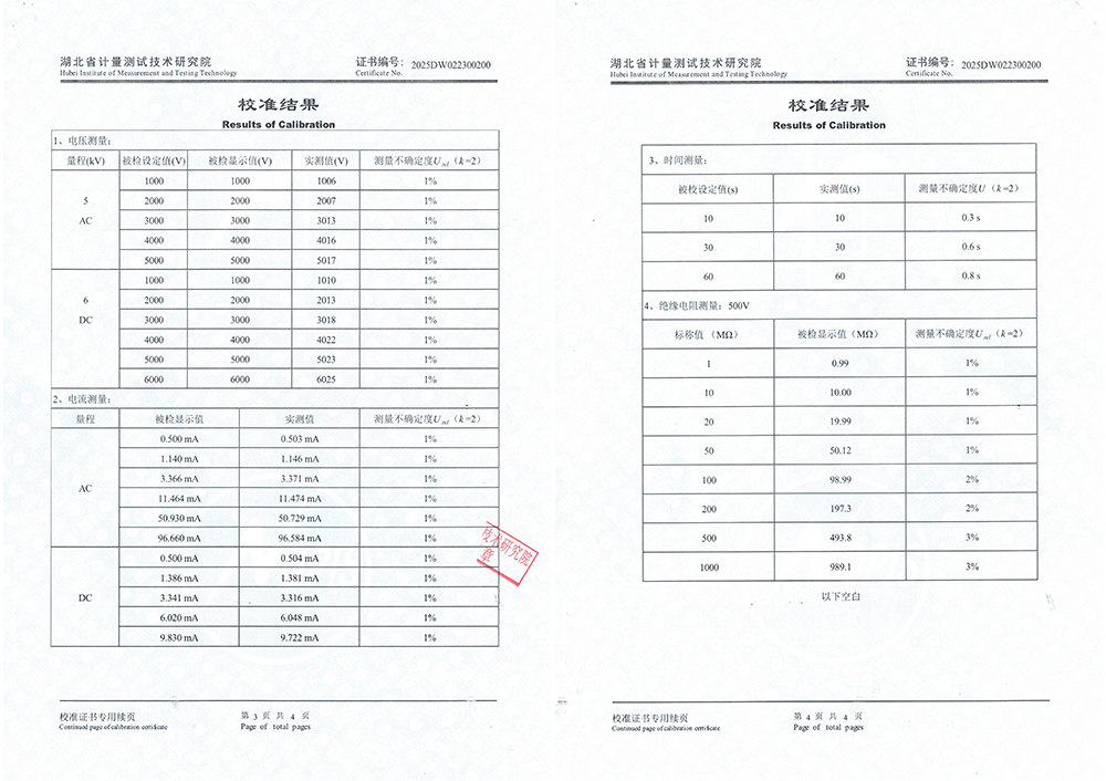 此次校準過程對KD7742智能絕緣耐壓測試儀來說是一次嚴苛的考驗。湖北省計量測試技術研究院作為計量校準機構,以其專業的技術水平和嚴謹的校準流程著稱。校準過程中,研究院對KD7742的各項性能指標進行了全面、細致的測試和評估,包括其交/直流耐壓測試、絕緣電阻測試等功能模塊的準確性和穩定性。經過一系列嚴格的測試,KD7742智能絕緣耐壓測試儀成功通過了校準,獲得了校準證書。這不僅證明了KD7742智能絕緣耐壓測試儀在設計和制造上的品質,也體現了武漢凱迪正大電氣有限公司對產品質量的嚴格把控和持續追求。