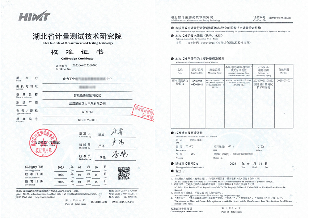 近日,電力工業某測試中心采購的武漢凱迪正大電氣有限公司的KD7742智能絕緣耐壓測試儀,成功通過了湖北省計量測試技術研究院的嚴格校準,并榮獲校準證書。這標志著KD7742智能絕緣耐壓測試儀在精確度和可靠性方面達到標準,進一步鞏固了其在電力測試領域的地位。